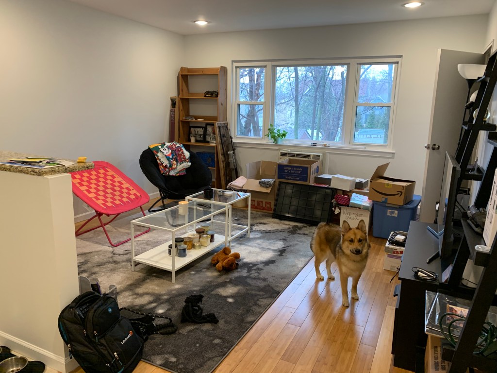 Three days before our move, the governor issued a curfew. We have already been working remotely so our grooves were down pat. I was on my way to his house to pick up our dog to make sure he was at my house on moving day. My sister graciously offered to watch him while we drove our belongings to and fro.