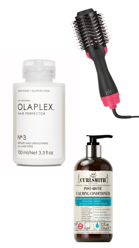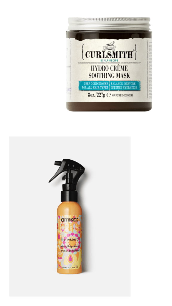 - After care: On my wash day, I made sure to use a lineup of strength and nutrient restoring products. I started with the Olaplex No 3, washed with the Not Your Mother’s Curl Talk Shampoo and Curlsmith Post-Biotic Conditioner, and deep conditioned with the Not Your Mother’s Matcha Green Tea Butter Mask. This line up really helped bounce my curls back to their natural state!